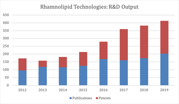 Figure 2. Worldwide R&D output (publications and patents) for rhamnolipid technologies, 2012-2019. Source: Wellspring Scout data.